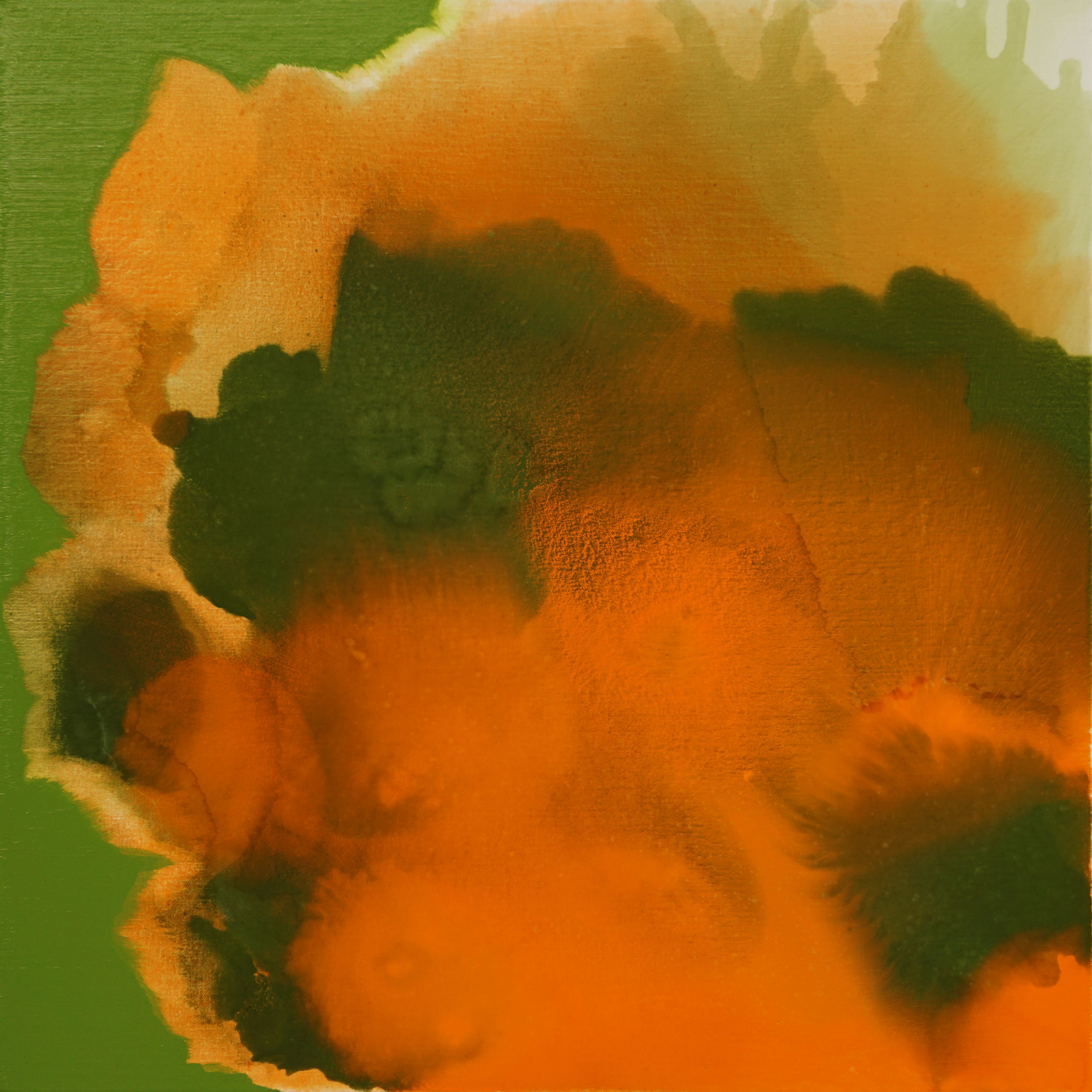 의도된 것이긴 하나 손끝에서 나오는 자잘한 테크닉을 피하고 공간 전체를 기탄없이 ‘통 크게’ 경영한다. 극도의 자연스러움이 물 속에서 뛰노는 물고기처럼 사각의 공간 안을 유영하고 있다. 이것은 작가가 작위와 무작위를 절묘하게 혼용하는 데서 귀결된 결과로 보인다. 가령 중앙의 색체 덩어리는 무작위적 프로세스에 의해 만들어진 것이다. 그의 작업 방식은 독특한 데가 있다. 털펜타인과 혼합된 안료를 캔버스에 올려놓고 손으로 화면의 상하, 좌우로 높낮이를 달리해 조정하는 방법을 사용하고 있다. 그러면 캔버스 위의 안료는 상하, 좌우의 높낮이에 따라 흘러내리게 되고, 작가는 그 흘러내림과 함께 번지기, 덧붙임을 추가하여 다양한 표정을 얻어낸다. 옅은 물감 사이로 보이는 작은 안료 입자들, 그런가 하면 그 주위를 에워싸는 접착력 있는 리퀴드의 포용력은 쉽게 흉내낼 수 없는 효과를 자아낸다. ‘색에 대한 민감성’은 그의 작품에서 자랑할만한 부분이다. 그의 작업은 미리 형태를 완전히 잡아놓고 진행하는 스타일이 아니다. 대강의 윤곽이 잡히면 색깔은 선정하고 그때 그때의 미적인 감정에 따라 작업을 불쑥 개시한다. 원하는 색을 입히고 그 위에 더 채도높은 색을 올린다. 색을 무덤덤하게 올리는 것 같지만 사실은 보자기에 감추인 마음의 빛을 풀어놓는 것과 같다. 그가 전달하려는 것은 가슴 벅찬 순간, 환호지를 때의 순간처럼 어떤 것에 크게 감동되었을 때의 마음 상태인 것이다. 그렇게 탄생된 촘촘하고 상쾌한 미적인 감정의 결, 그것의 유속은 느리며 속이 훤히 들여다보일 정도로 투명하고 시원스럽다. 색의 사용은 아주 우연한 기회에 시작되었다고 한다. 강릉에서 강의를 마치고 돌아오던 중 그는 시골길에서 인상깊은 광경을 목격한다. 파란하늘에 까치밥으로 남겨놓은 분홍색 감을 보고 너무 예쁜 나머지 그 감흥을 못 잊어 색을 본격적으로 사용하기 시작한 것이다. 자연의 고운 빛에 그만 연민의 정을 느끼게 된 것이다. 그 이후로 색깔과 뗄레야 뗄 수 없는 사이가 되고 말았다. 근 20년 간 작가는 색깔과 그것의 변주를 연구해왔다. 색깔이라면 일가견을 지닌 사람이다. 그러던 중 몇 년전부터 재료를 안료(피그먼트)로 바꾸고 털펜타인의 효과를 적극 활용함으로써 지금과 같은 단계에 이르게 되었다. (여전히 외각은 두툼한 질감효과가 좋은 오일로 착색한다.)